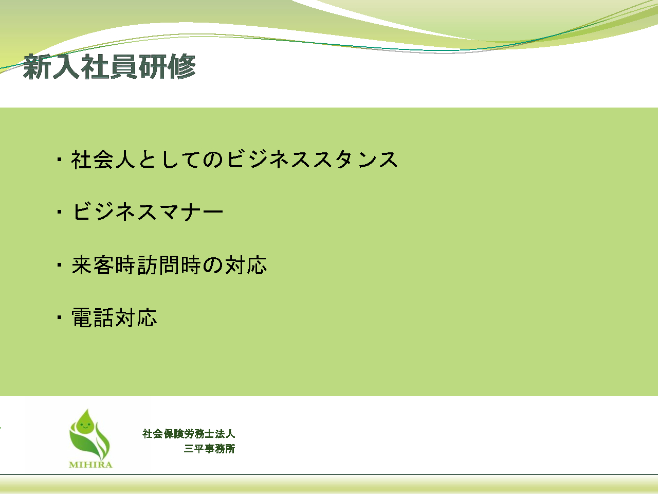 新入社員に向けて、①ビジネスマナー、②アサーティブ、③ハラスメントの研修を行いました。